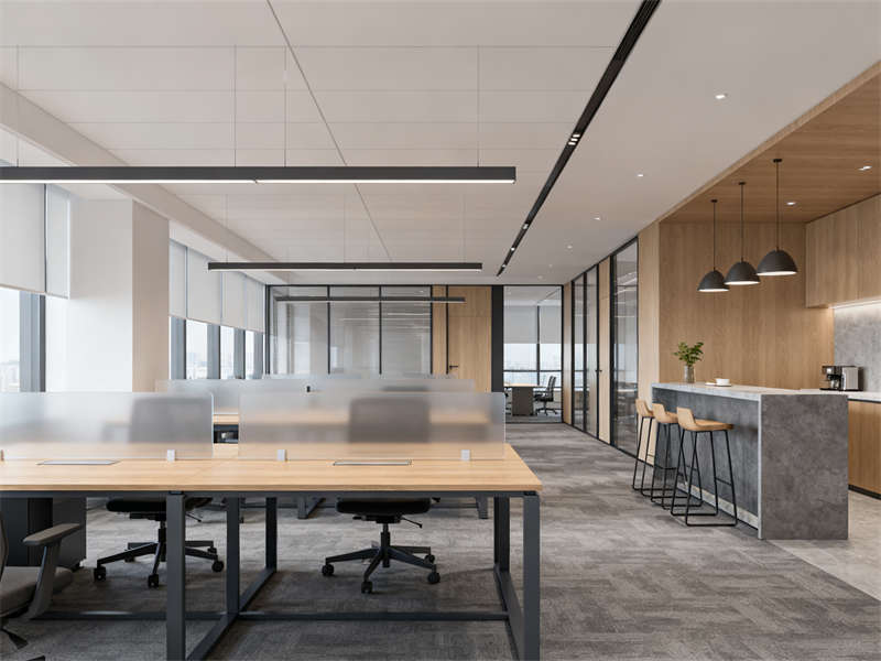中型會議室圍繞協(xié)作功能展開,長條式會議桌與玻璃隔斷搭配,既保證空間開闊,又能與外部辦公區(qū)形成視覺聯(lián)動,灰色布藝座椅與頂部圓形吊燈呼應(yīng),讓會議場景兼具功能性與舒適感。茶水間則通過淺灰石英石臺面、木色護墻板與暖光燈帶,營造輕松休閑的氛圍,成為辦公間隙的放松節(jié)點。