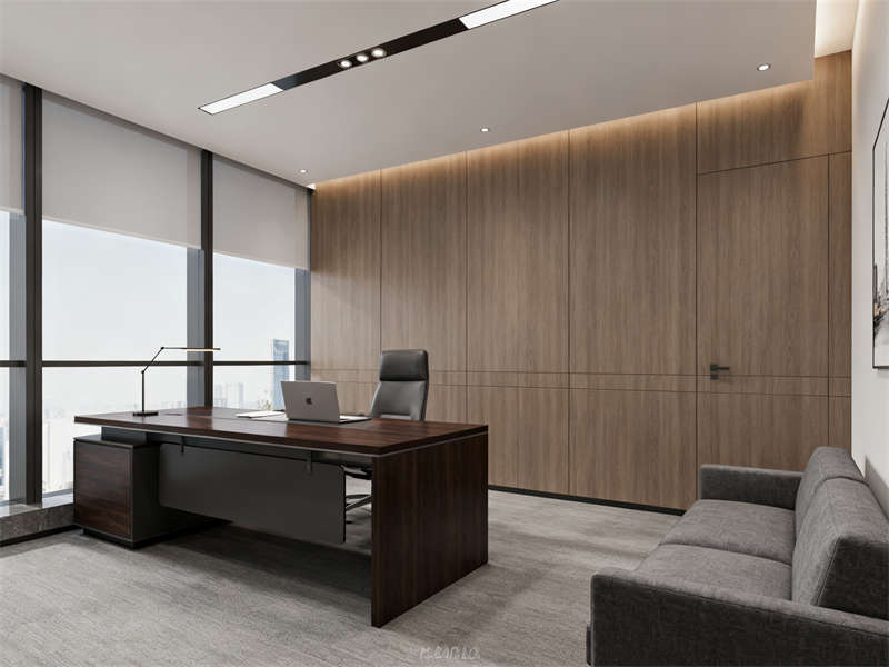 開放辦公區(qū)以通透協(xié)作為設(shè)計重點,半透明磨砂玻璃隔板兼顧隱私與互動,木色桌面與深灰金屬支架結(jié)合,延續(xù)整體材質(zhì)基調(diào),搭配簡約照明,營造專注且不壓抑的工作氛圍。獨立辦公室劃分出辦公與接待區(qū)域,木飾面背景墻搭配淺灰布藝沙發(fā),在保持商務(wù)感的同時,增添柔和質(zhì)感,滿足私密溝通需求。