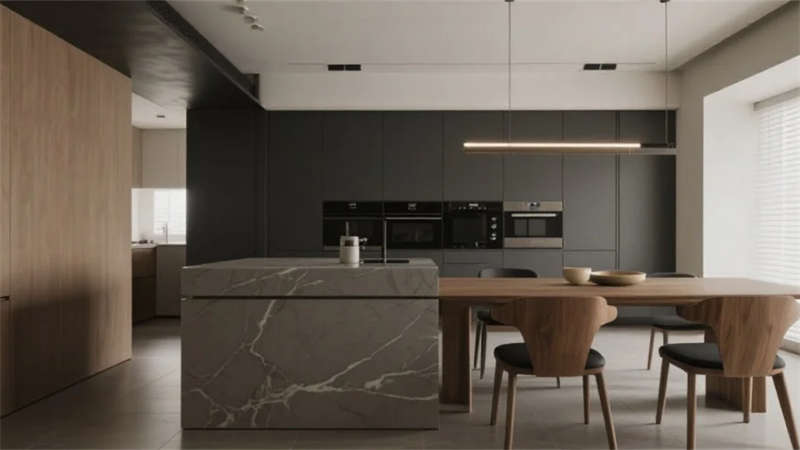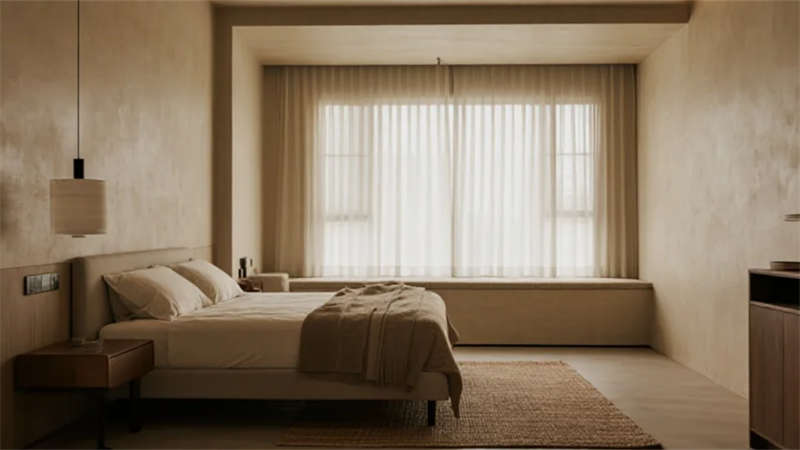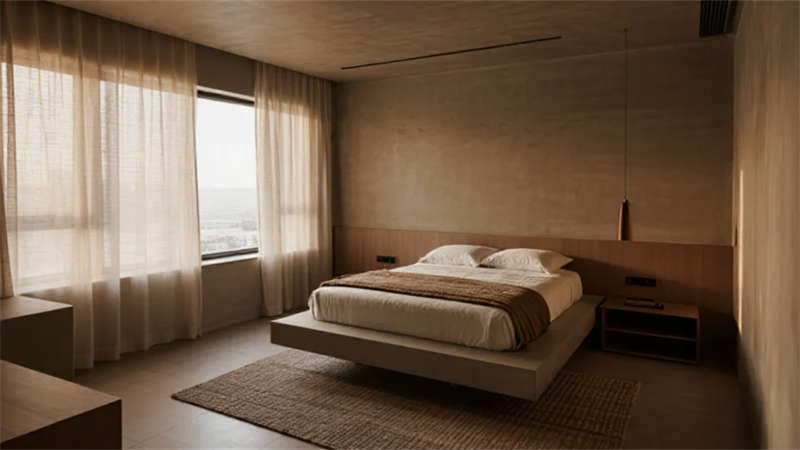空間布局強(qiáng)調(diào)流動(dòng)性與光影互動(dòng),落地窗成為連接內(nèi)外的畫框,將庭院竹影、城市天際線轉(zhuǎn)化為動(dòng)態(tài)藝術(shù)裝置。無主燈設(shè)計(jì)搭配隱藏式照明系統(tǒng),在夜間暈染出柔和的光韻層次。衛(wèi)浴空間以灰調(diào)水磨石營造靜謐感,獨(dú)立浴缸臨窗而設(shè),沐浴時(shí)可見星月交輝。